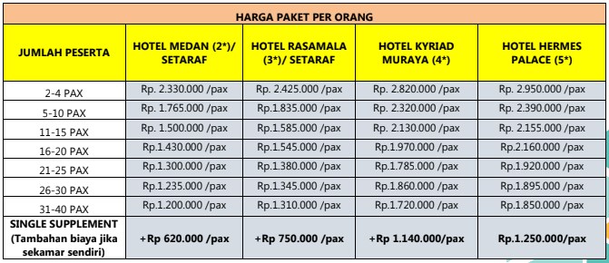- Akomodasi 1 kamar berdua (twin Sharing) atau Bertiga (triple Sharing) untuk jumlah peserta ganjil